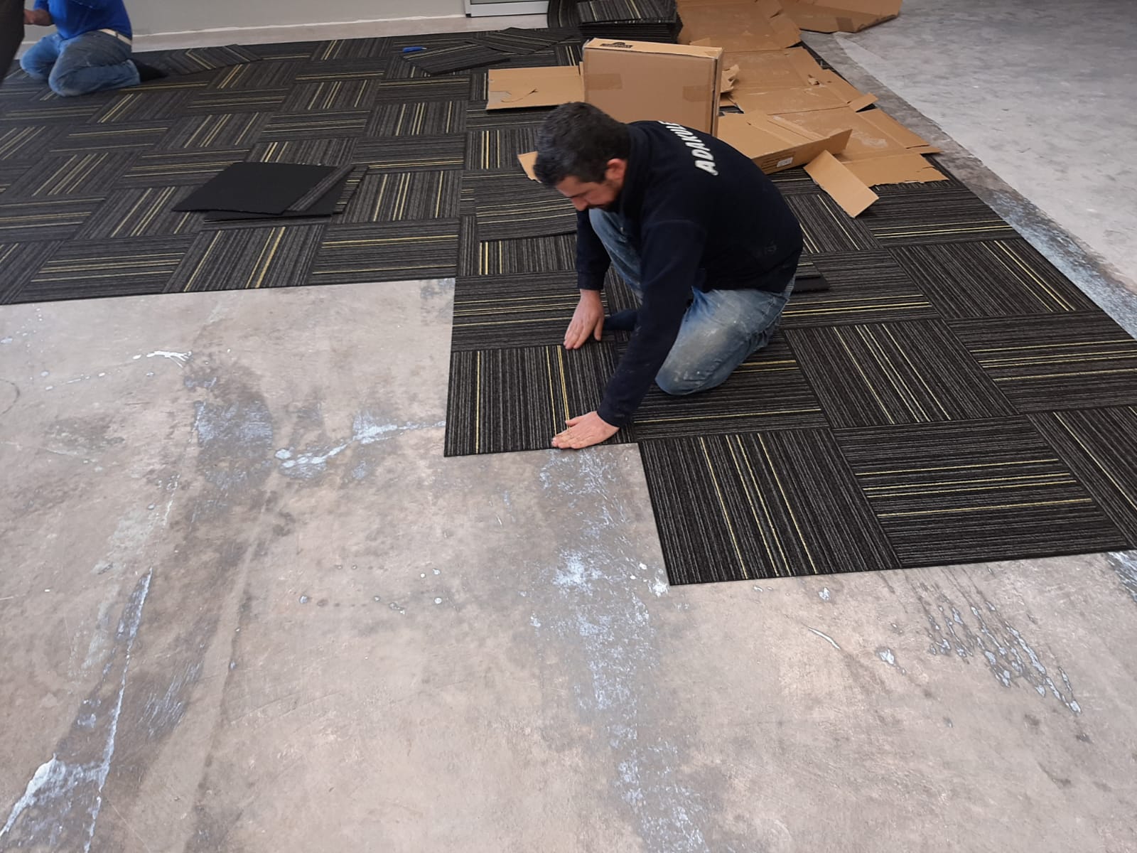 - Rulo halı veya modüler karolar zemine düzgün şekilde serilir.